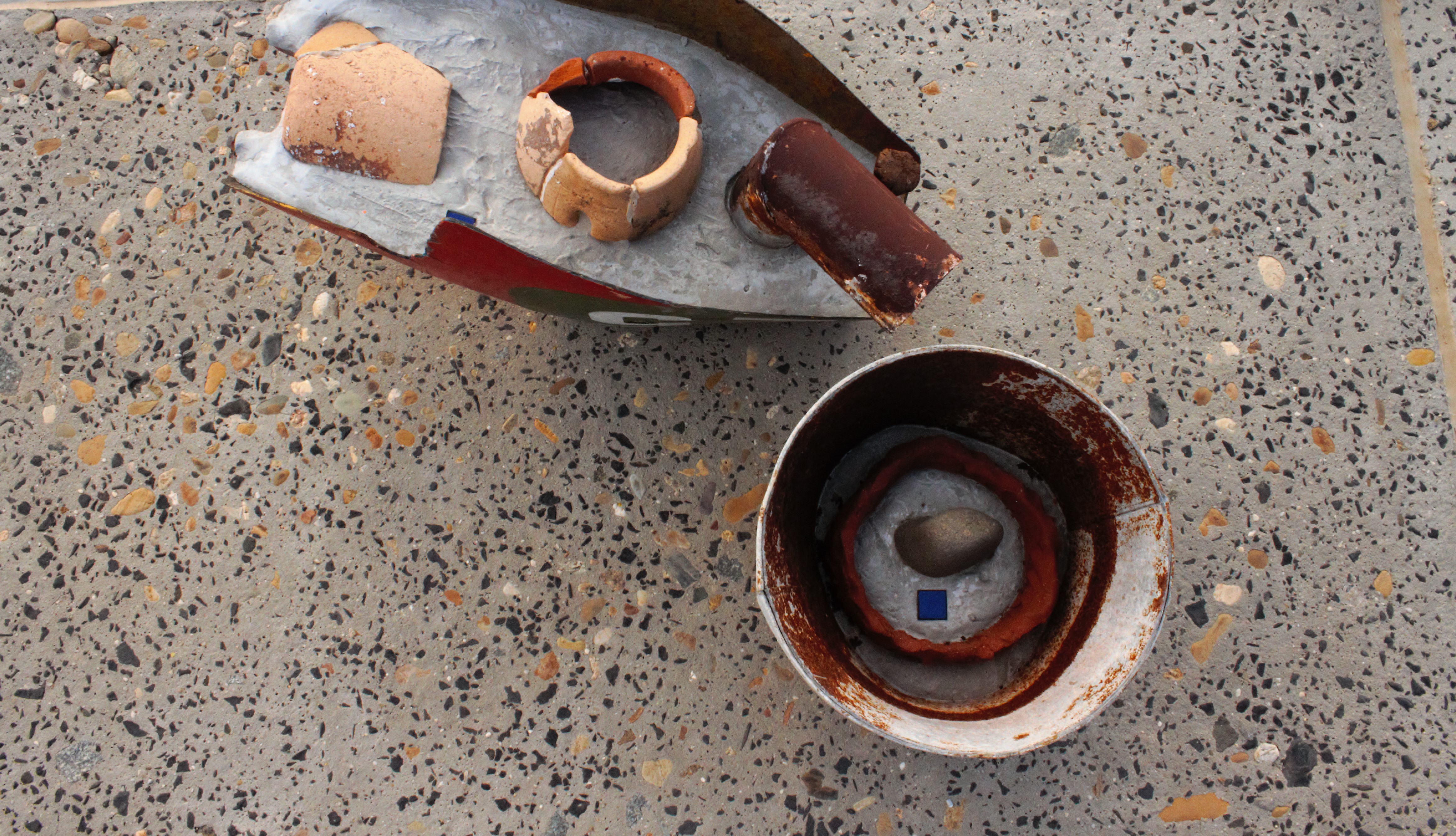 Retrieve, Retreat is a sculptural collection of found and reassembled vessels composed from an array of materials – cement, wood, brick, metal, stone, glass, nails, fabric, enamel paint, ceramic shards, and other salvaged fragments. Intimate in scale and tactile in presence, these works invite touch as much as observation. Their layered surfaces – textured with coats of paint, wear, and residue – underscore their fundamentally haptic nature, calling forth the language of the hand and the memory embedded in material.