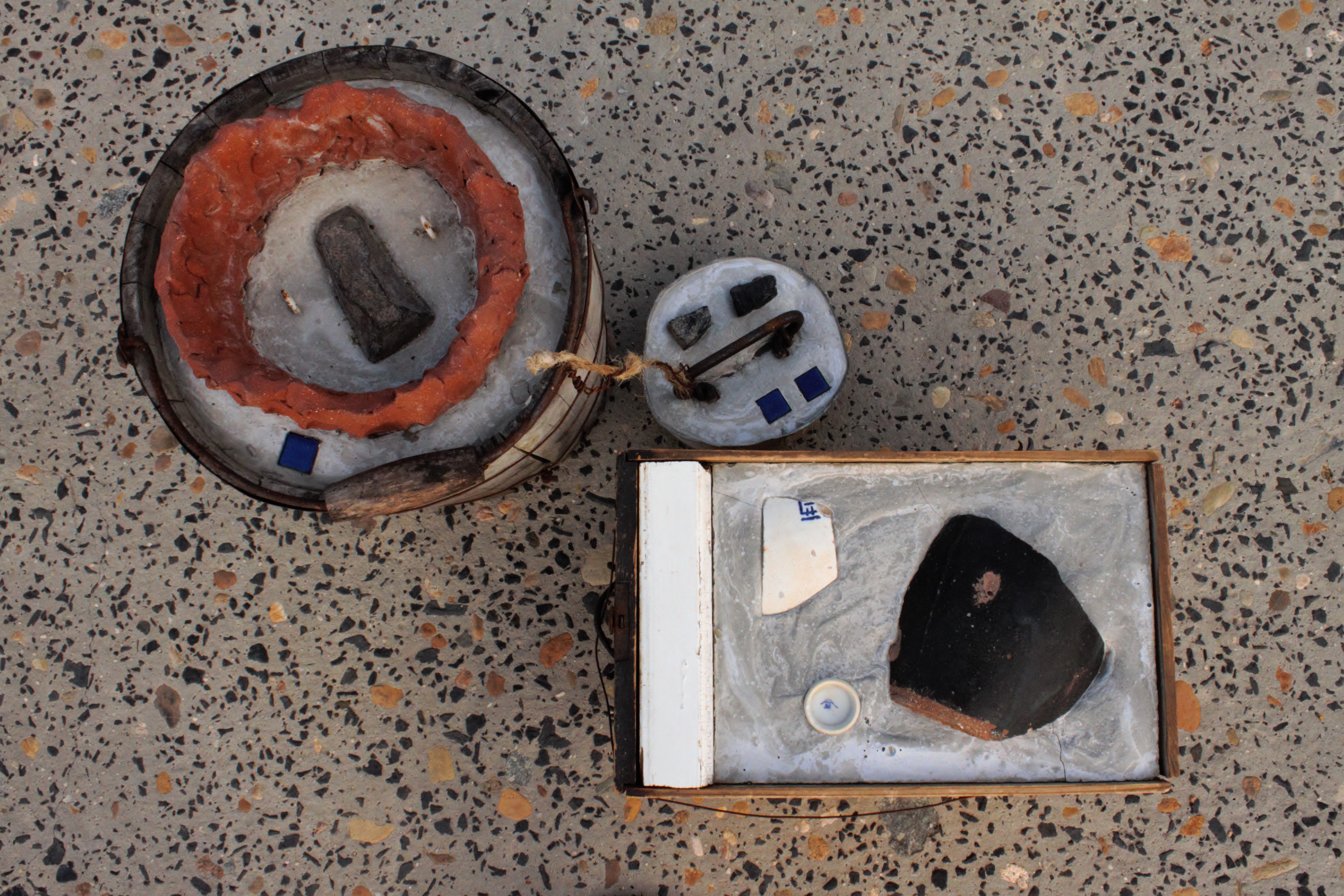 The inclusion of cement is deliberate. As a building material, it speaks to ideas of permanence, construction, and modernity, but here it is reimagined as an adhesive for broken time – a substance that binds memory as much as mass. It makes visible the tension between synthetic fixity and organic decay.