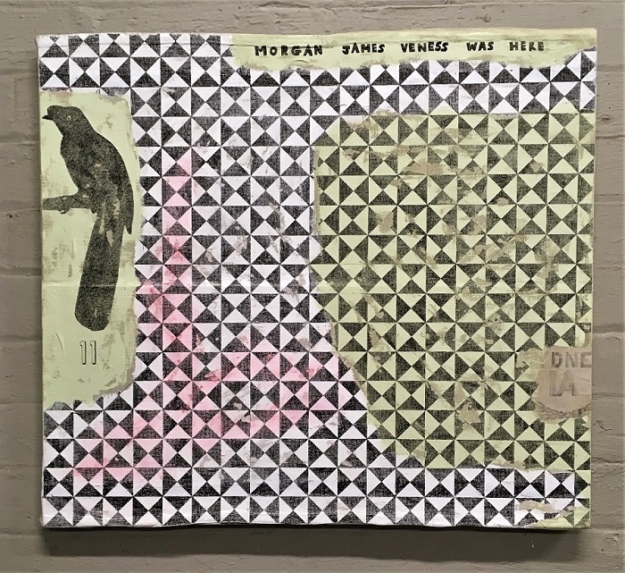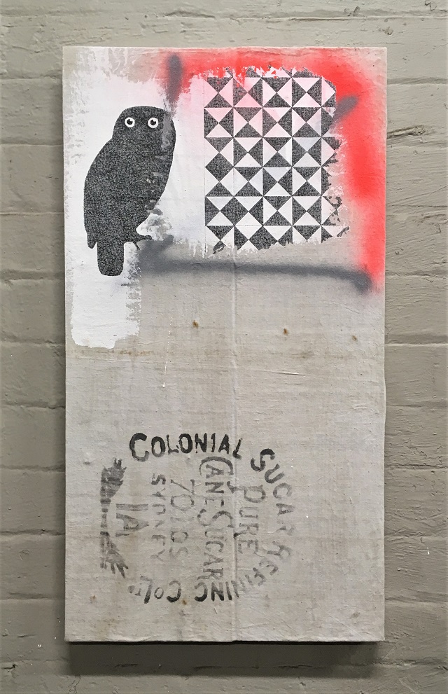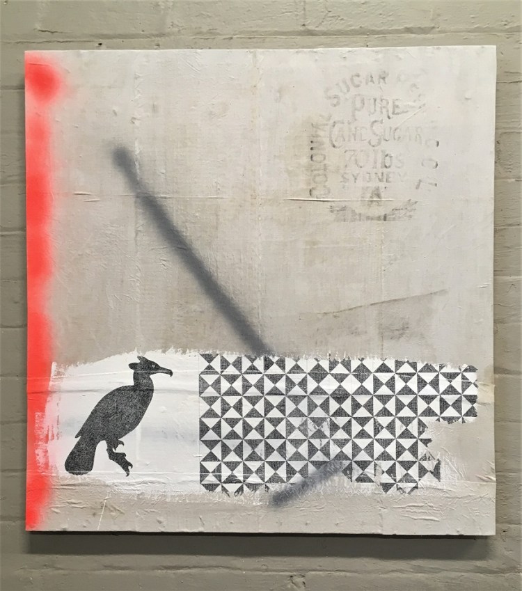 A Pattern of Extinction draws together these threads of history, science, and personal memory through a symbolic visual language. Each work centers on the shadowy imprint of an extinct or endangered bird, captured in a recurring pattern that seems stamped or fossilized onto reclaimed CSR sugar sacks—ghosts of birds preserved not in bone, but in fabric and pigment.
