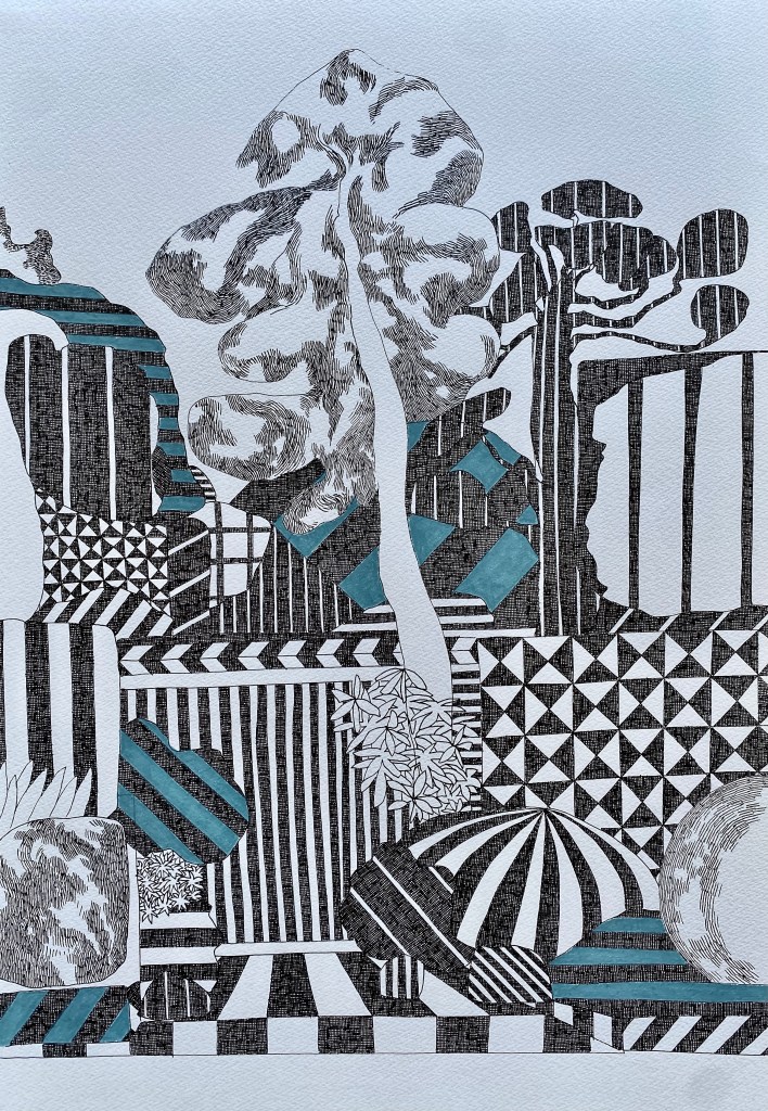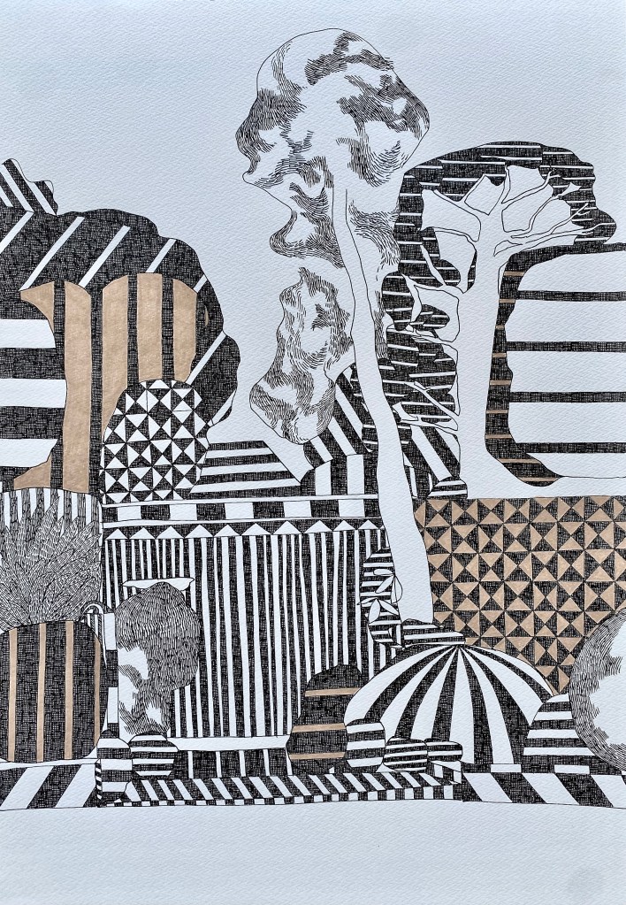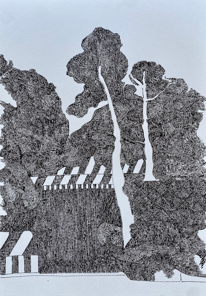 Likewise, the works in Assembling the Terrain reflect a similar ethos. The surfaces are marked with black ink and interwoven with carefully distributed threads of color. These gestural “hatchings” replicate the actions found in the garden—trimming, removing, refining. They are not just visual patterns, but echoes of a deeper rhythm: a quiet choreography of restraint and release. The result is a layered terrain—part natural, part constructed—where order coexists with flux, and perception unfolds through deliberate looking.