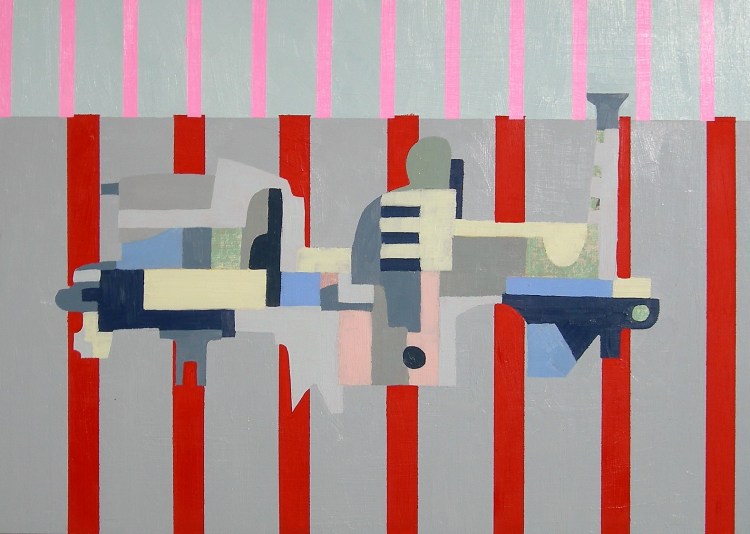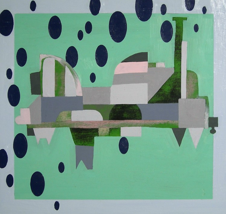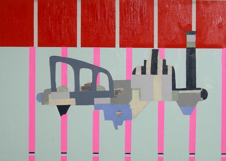 Boom, Boom, Treasure Hunters (2006) is a progressive series of oil paintings, created on retrieved and repurposed board, that evolved during a formative period living in Tokyo—a city where the visual density and relentless layering of form seemed both overwhelming and oddly familiar. The works emerged through a process of quiet observation and accumulation, as I began documenting the strange and persistent shapes that populate the city’s subconscious visual field. These are not the grand architectural landmarks or carefully designed icons of urban identity, but the accidental forms—the overlooked, the oddly shaped, the marginal objects that quietly define the texture of place.