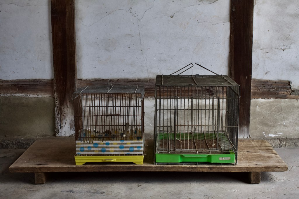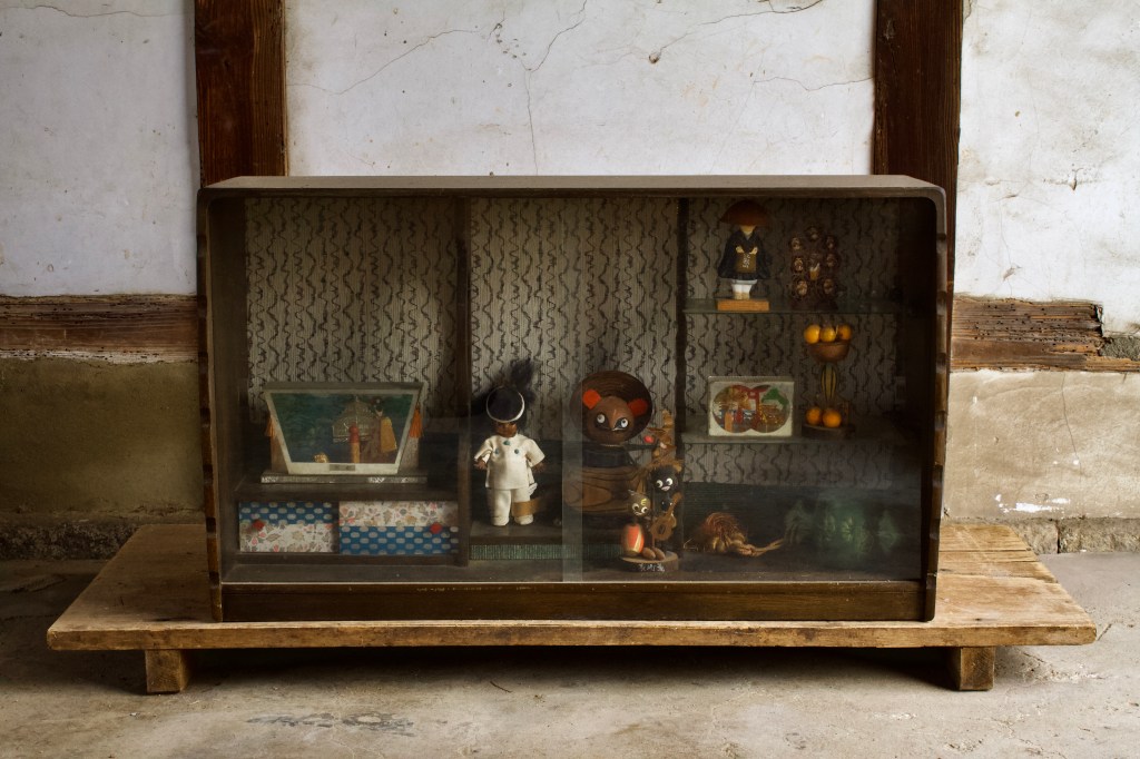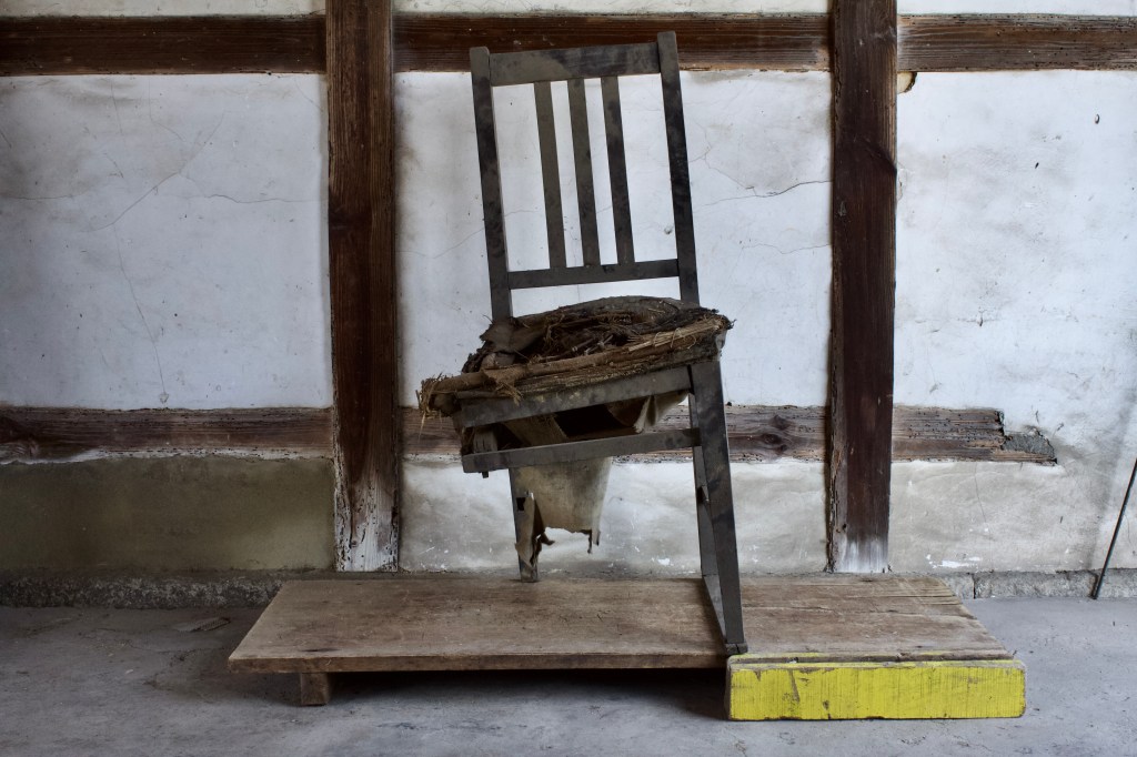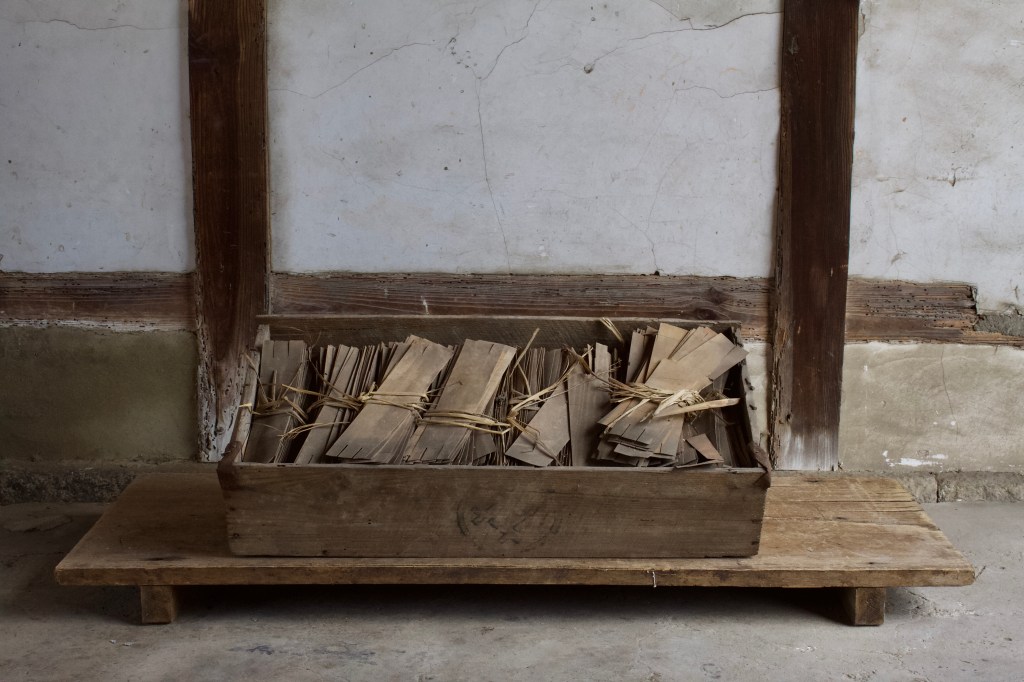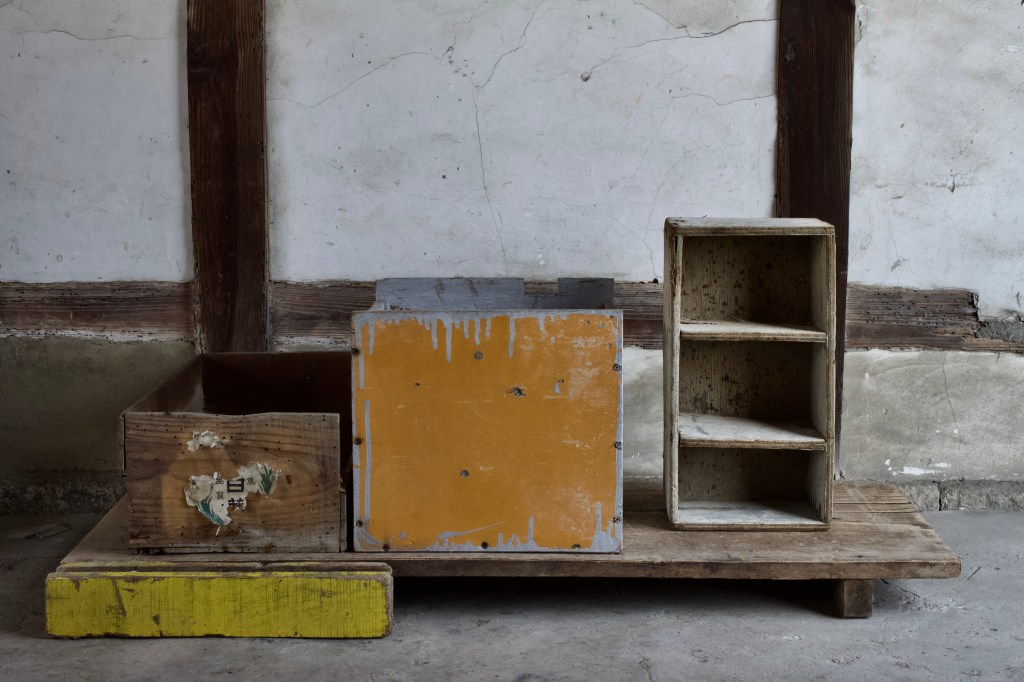 The installation is situated against the exterior wall of a Taishō-period (1912–1926) farm storage building in rural Japan. The architecture becomes an integral part of the work: its aged wooden beams frame and box the individual compositions, functioning both as structural boundary and historical context. Weathered and utilitarian, the building itself speaks of seasonal rhythms, rural labour, and the long continuum of use.