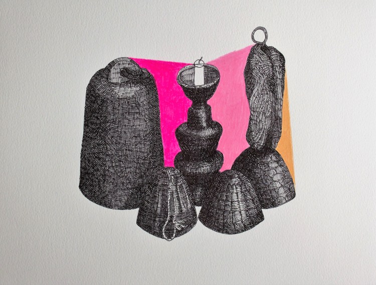 Silent Night is a series of intimate ink and coloured pencil drawings on cartridge paper (35 × 30 cm), created between 2011 and 2012. The works focus on a small ensemble of rustic metal objects – each drawn with care, memory, and attentiveness to their quiet presence. Among them are four Japanese bronze bells, or furin, one distinguished by a naturally worn wooden handle; an antique brass altar candlestick, still bearing the stump of a once-lit candle; an old oil lamp, modest in scale but rich in patina; and a single weight, its surface dulled by age and use.